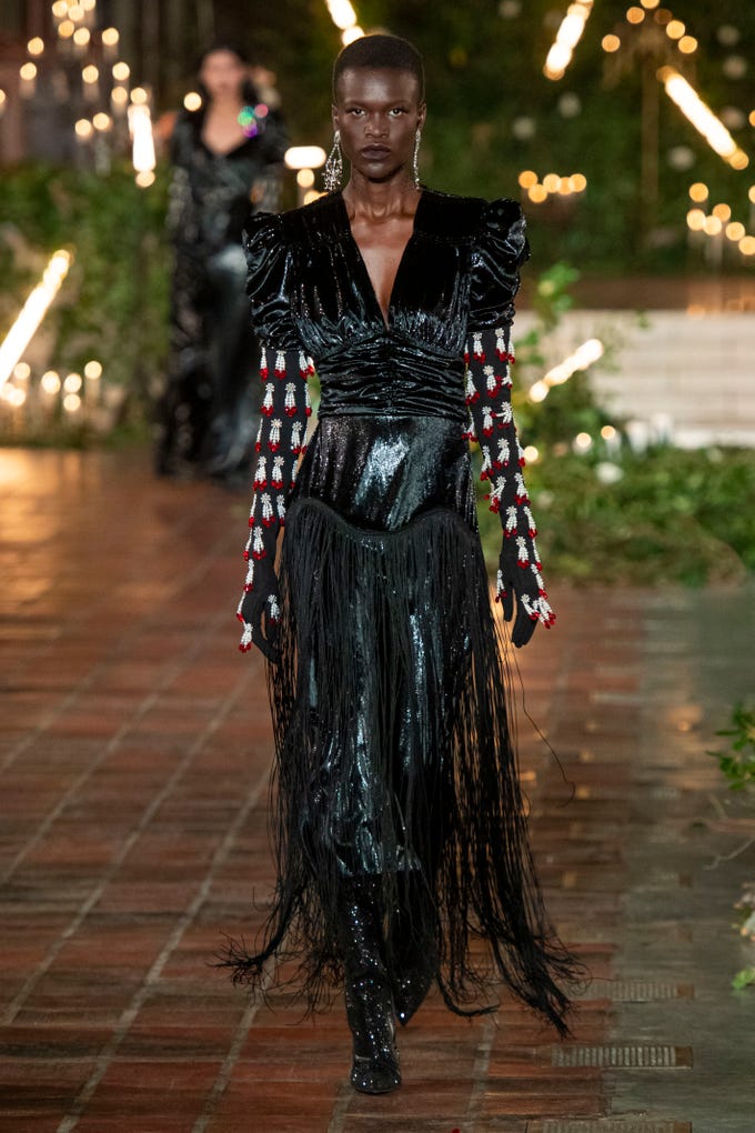This runway show was mystical, gothic, and beautiful. The models of Rodarte’s fall/winter collection strutted down the runway in beautiful gowns, looking like real life vampires and witches, as the inspiration for this collection was Dracula. The looks had an element of magic to them and had many spooky features, such as statement sleeves, capes, purple orchid leis, spiderweb designs, and lots of sparkles. The gowns were mainly dark purple and blue, black, silver, and deep red. It was very artistic, yet feminine and wearable.