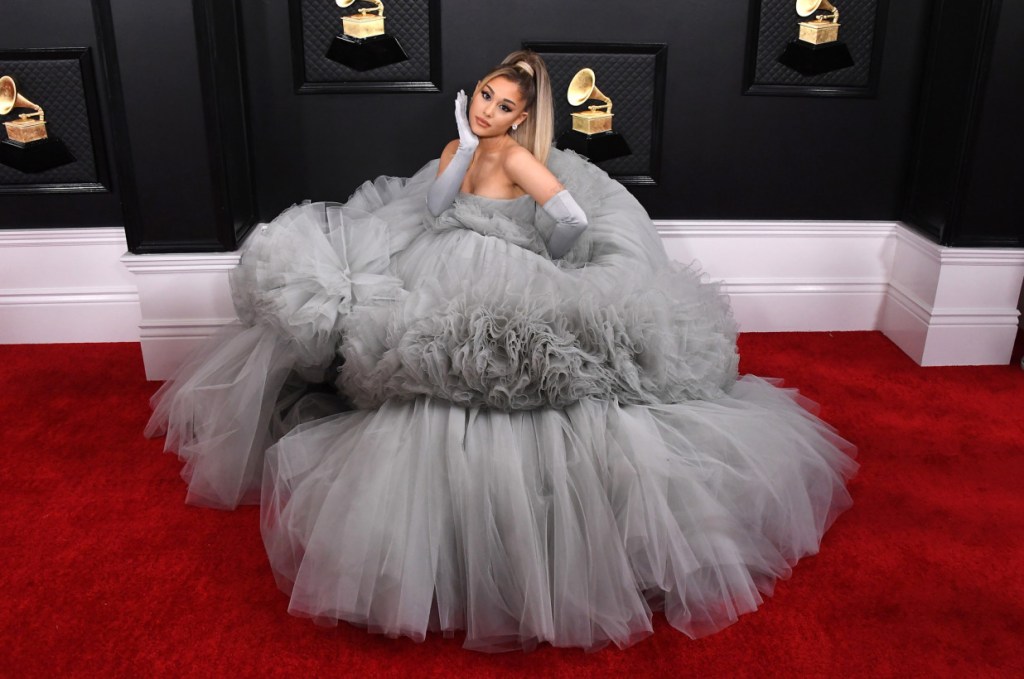 Ariana Grande made a ‘grande’ entrance at this years Grammy Awards. She was wearing a huge gray gown custom created by Giambattista Valli Haute Couture. A video has surfaced the internet of this exact moment; the cameraman had Grande take a video and photo prancing around in her extravagant dress. She is confident and stunning, and that’s why I believe she was one of the best dressed celebrities on the red carpet. She also managed to take her signature high pony along with her!